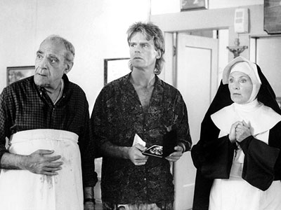 A camera assistant measures the distance to the stand-in's nose, then adjusts focus on the camera. Lights are aimed, sound gear tested, trees placed in the background. The hairstylist is working on a bald patch for Vigoda's stunt double. One of the crew, job done for the moment, shows off his skill with a short lasso. The director pores over his script, already behind schedule, looking for shots he can do without.