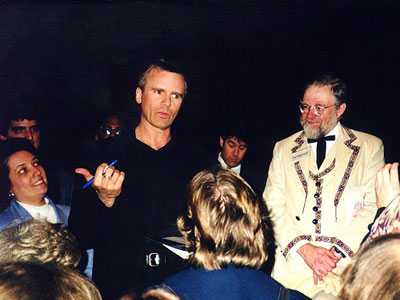 Another recognizable face in the crowd belonged to Jarrad Paul, known to fans of Legend as "Skeeter". He had come that evening to enjoy the seminar, and of course couldn't help but notice J. Randolph Cox's Legend suit. As the audience gathered at the stage, Michael Greenburg approached Mr. Cox and introduced him to "Skeeter". Mr. Cox's initial reaction was to quote a favorite line from Legend: "Man with a donkey!" and the two of them enjoyed a bit of mutual admiration. Jarrad admired Mr. Cox's outfit and devotion to the series, and Mr. Cox in turn praised Jarrad's comic genius in the show and remarked on his change in appearance without the electrified hair. Regarding the comic scenes in Legend, Jarrad revealed that many of the exchanges he shared with Richard were not scripted. Often he and Richard had worked the scenes out between themselves in advance, and he credited their success to Richard's comic skill and timing. He sited in particular the first scene they shared in which Pratt is directed to the sheriff's office, and talked about how much he enjoyed the pairing. When asked what else he had been up to since the demise of Legend, he mentioned an episode of Seinfeld entitled "The Voice" which aired on October 2, 1997 in which he played Kramer's overly efficient assistant.