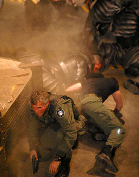 A carload of 20-year-olds stops opposite a row of trailers parked alongside one of the roads leading into the Greater Vancouver Regional Development area. The driver asks a man directing traffic if there's a TV show being shot at the GVRD today. He nods and says, "Yes." The young man then discovers that the series is, in fact, Stargate SG-1.