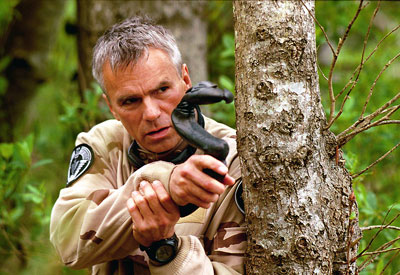 Now, this reporter supports the very lovely Mr Anderson in almost all of his less conventional adventures. However, it has to be said that if the good Lord had meant us to fly up to the top of a mountain and then toss ourselves down the sides of it strapped to planks of wood or titanium or whatever said appendages are made from, then we'd all be doing it. Anderson shrugs such comments aside. "Oh, don't you play that card on me," he scoffs, "The good Lord didn't make us with clothes, did he? And people do that almost every day... put on clothes, I mean." A suggestion that not all of us are blessed with a body beautiful and that most wear clothes to protect innocent bystanders from an eyeful of something unpleasant gives him a moment's pause. "Yeah! Well... " he goes on, hurriedly changing the subject, "Season Eight! Oh, how do I feel about our year eight? I feel fine about it." In fact, Anderson is delighted that generous financial support from The Sci-Fi Channel has allowed the "Stargate" team to saddle up for yet another year. "I truly am delighted The Sci-Fi Channel and MGM wish to continue with what I believe is a terrific franchise.
