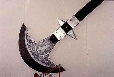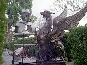 In the upstairs offices above the soundstages, the blade from "The Legend of the Holy Rose" (left) hangs on the wall of the editing room, because "that's where they do the cutting." The door to the office shared by Richard and Michael Greenburg (right) proudly displays their names.