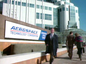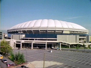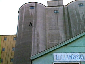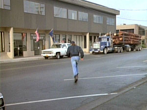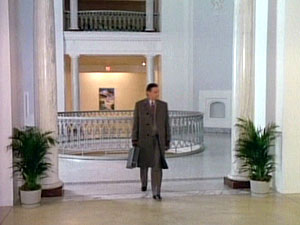 The exterior of the Phoenix Foundation was the unique Westcoast Energy building on Georgia Street (left), which is entirely suspended from a central concrete column. The interior offices were built at the studio, including Pete Thornton's office (right), complete with golf clubs in the closet.