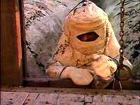 Made a protective suit from netting, a melted garden hose, and duct tape