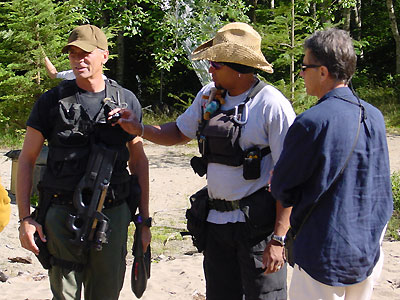 Now with Stargate SG-1 following in the footsteps of MacGyver as a global phenomenon, that diplomacy has enabled Richard to balance his roles as father and celebrity, actor and executive producer. Taking time out of his busy day for an interview, he slips away to shoot another scene, then returns after each take to answer more questions. His assistant drops by to let him know that later he will be needed to edit tapes of two other episodes that have just come in, and there are casting decisions to be made for an upcoming character. Despite the many pressures and responsibilities, the atmosphere on the set remains light. In the morning chill and the afternoon heat of the GVRD in North Vancouver, O'Neill and Teal'c pursue their prey in the episode Death Knell. The script calls for O'Neill to check in with General Hammond by radio as he walks through the forest. Bill Nikolai, Richard's stand-in, waits off camera and reads Hammond's lines from the script for O'Neill to respond to. In the first rehearsal, the timing is off, and O'Neill walks completely beyond camera range before Bill finishes his lines. Grinning, Richard speaks into his radio and calls back, "Could you possibly read any slower, Sir??" "I'm just doing what it says!" Bill jokes back as the crew laughs and sets up for another take.