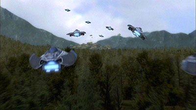 Ori warships carry squadrons of smaller fighter craft. Long and slender in shape, with wing-like extensions that flare out at the rear, the smaller craft are able to exit the warship in space. Fighters are highly maneuverable in battle, they are capable of high rates of speed, and are also able to hover. They are equipped with weapons and shield capabilities, and they proved to be a daunting adversary for both alkesh and death glider ships in the battle over Chulak. Fighters have also been used for planetary surveillance. When Ori ground forces are required, a ring transporter platform can be clamped to the underside of a fighter craft and deposited on a planet's surface, allowing Ori warriors to ring down to the planet from the warship in orbit.