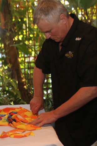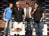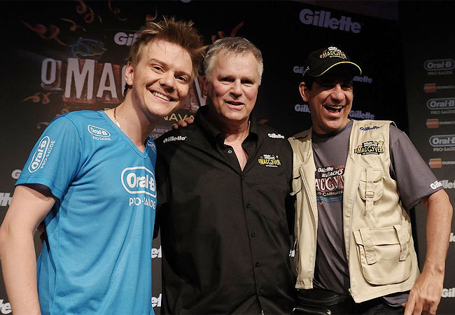 On Wednesday, February 15th, Richard attended a press conference at the Amado Bahia Restaurant in Salvador where he was joined by André Marques, host of "Video Show," as well as singer Michel Teló, a fan of MacGyver since childhood, and Lelys Durval, the lead singer of the Brazilian band Asa de Águia, who enjoys a reputation as the "Brazilian MacGyver" because of his habit of always carrying a pack with essential items. Richard also learned about "abadá," a Mardi Gras tradition, as he accepted the challenge to customize a T-shirt from the band Asa de Águia using a Swiss army knife.