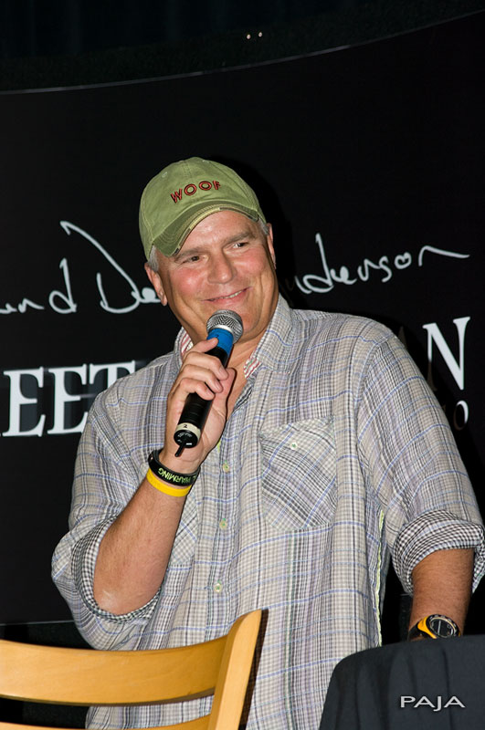 Another fan began his question with a story. He explained that when he would mention the name "Richard Dean Anderson," people would always ask, "Who?" and Richard interrupted again to ask, "It was my mother, right?" Continuing, he explained that he would get the same reaction at the mention of "Jack O'Neill," but if he would show a picture, people would immediately recognize "MacGyver!" He asked if people often recognized Richard as MacGyver, and with a straight face, Richard replied, "No!" Then laughing, he admitted that he does indeed get that a lot. He also said there have been times when people didn't recognize him but wondered, "Who is this grizzled old fart who all the girls are saying nice things about? And all I have to say to them is, 'Neener, neener, neener!' "